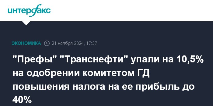 "Префы" "Транснефти" упали на 10,5% на одобрении комитетом ГД повышения налога на ее прибыль до 40%