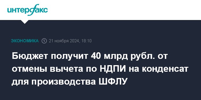 Москва. 21 ноября. INTERFAX.RU - Бюджет РФ получит порядка 40 млрд рублей от отмены на 5 лет вычета по НДПИ по конденсату, направляемому на производство ШФЛУ (широкая фракция углеводородов), сообщил журналистам замглавы Минфина Алексей Сазанов.
