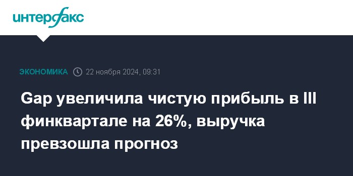 Москва. 22 ноября. INTERFAX.RU - Американская Gap Inc., владеющая сетью магазинов одежды, увеличила чистую прибыль в третьем финансовом квартале на 26%, выручку - на 2%.