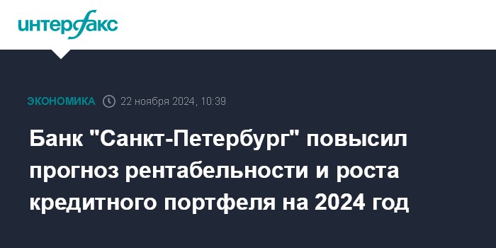 Москва. 22 ноября. INTERFAX.RU - Банк "Санкт-Петербург" повысил прогноз по рентабельности капитала на 2024 год до 25% с 24%, сказано в презентации кредитной организации.