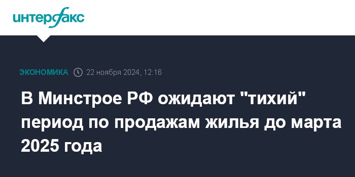 Москва. 22 ноября. INTERFAX.RU - "Тихий" период по продажам жилья ожидается в России до марта 2025 года с учетом данных за сентябрь и октябрь, сообщил в пятницу замглавы Минстроя РФ Никита Стасишин.