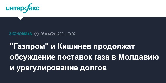 "Стороны обсудили актуальные вопросы взаимодействия в газовой сфере. В частности, стороны договорились продолжить обсуждение вариантов организации поставок российского природного газа в Молдову с 1 января 2025 года, а также путей урегулирования задолженности АО "Молдовагаз" перед группой "Газпром", - сказано в сообщении по итогам.