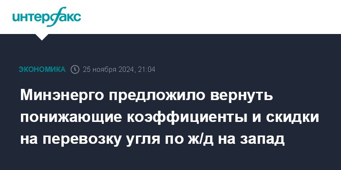 В октябре Минэнерго сообщало, что считает важным заключение РЖД соглашений на 2025 год о вывозе угольной продукции в восточном направлении со всеми угледобывающими регионами, имеющими такие соглашения на 2024 год, а также предлагает создать новые - на Северо-Запад и Юг.