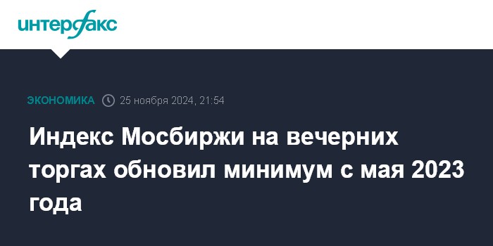 Москва. 25 ноября. INTERFAX.RU - Индекс МосБиржи на вечерней сессии в понедельник продолжил снижение и обновил минимум с мая 2023 года из-за подешевевшей нефти (фьючерс на Brent упал к $73 за баррель), остающихся опасений эскалации геополитической напряженности вокруг конфликта на Украине, а также ожиданий ужесточения монетарной политики ЦБ РФ в декабре.