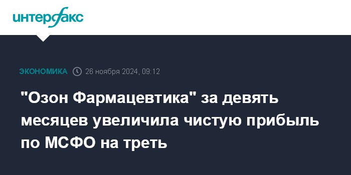 Москва. 26 ноября. INTERFAX.RU - ПАО "Озон Фармацевтика" (Тольятти, Самарская область) за девять месяцев текущего года получило 3,4 млрд рублей чистой прибыли по МСФО, что на 32,2% больше по сравнению с аналогичным периодом прошлого года, говорится в финансовой отчетности компании.