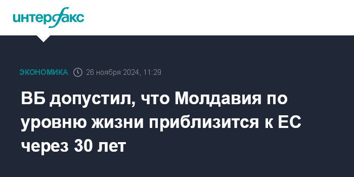 Москва. 26 ноября. INTERFAX.RU - Молдавия, в случае реализации масштабных реформ, может добиться ежегодного экономического роста свыше 5% в среднесрочной перспективе и достичь конвергенции со средним уровнем доходов в ЕС в течение трех десятилетий, говорится в страновом экономическом меморандуме Всемирного банка "Достижение уровня жизни Евросоюза за одно поколение".