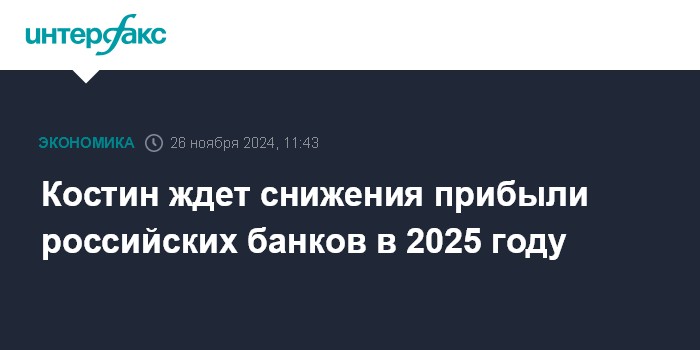 Москва. 26 ноября. INTERFAX.RU - Глава ВТБ Андрей Костин прогнозирует снижение прибыльности российского банковского сектора РФ в 2025 году в условиях высокой ключевой ставки и жесткого регулирования Банка России. Он заявил об этом на Международном форуме Финансового университета в контексте обсуждения повышения налогов для банков.