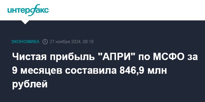 Чистая прибыль "АПРИ" по МСФО за 9 месяцев составила 846,9 млн рублей
