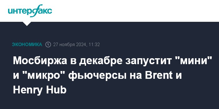 Москва. 27 ноября. INTERFAX.RU - "Московская биржа" 2 декабря начнет торги на срочном рынке расчетными мини-фьючерсами на нефть Brent и микро-фьючерсами на природный газ Henry Hub, сообщает торговая площадка.