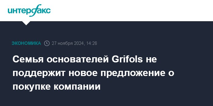 Москва. 27 ноября. INTERFAX.RU - Семья Грифолс, владеющая порядка 30% акций испанского производителя лекарственных препаратов Grifols SA, не планирует поддерживать новые предложения сторонних инвесторов о покупке компании.