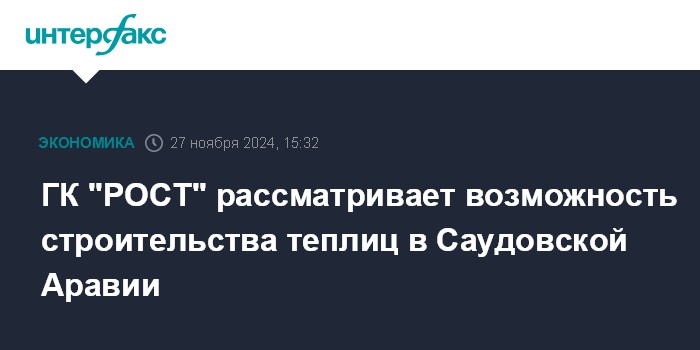 Москва. 27 ноября. INTERFAX.RU - ГК "РОСТ", ведущий производитель овощей закрытого грунта в РФ, рассматривает возможность строительства теплиц в Саудовской Аравии.