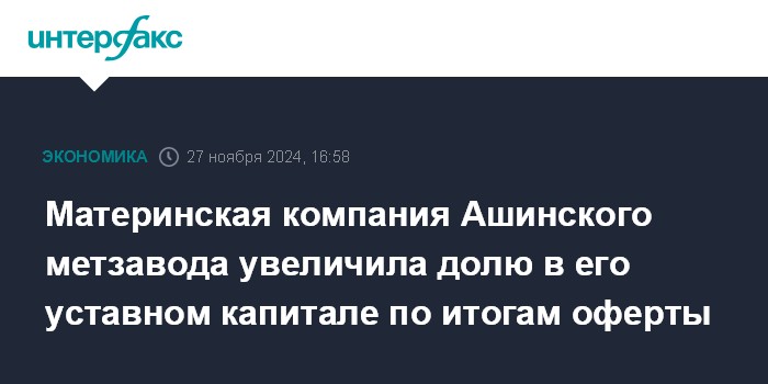 Материнская компания Ашинского метзавода увеличила долю в его уставном капитале по итогам оферты