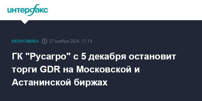 ГК "Русагро" с 5 декабря остановит торги GDR на Московской и Астанинской биржах