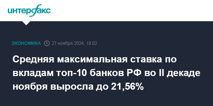 Средняя максимальная ставка по вкладам топ-10 банков РФ во II декаде ноября выросла до 21,56%