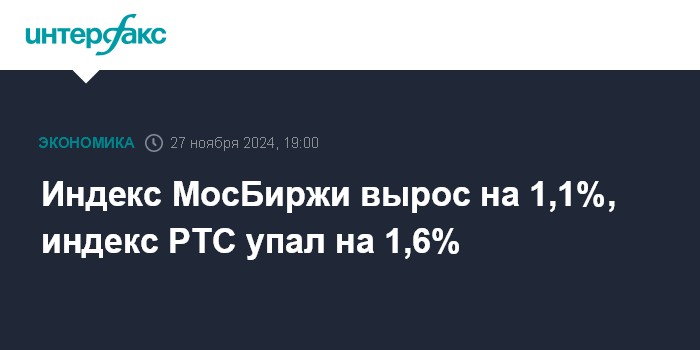 Индекс МосБиржи вырос на 1,1%, индекс РТС упал на 1,6%