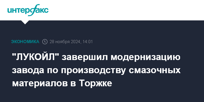 Москва. 28 ноября. INTERFAX.RU - "ЛУКОЙЛ" завершил модернизацию завода смазочных материалов в Торжке, ранее купленного у Shell.