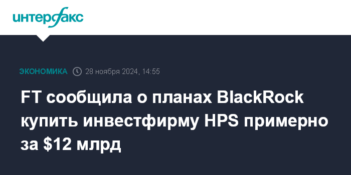 Москва. 28 ноября. INTERFAX.RU - Американская инвесткомпания BlackRock, крупнейшая в мире по объему активов под управлением, достигла соглашения о покупке меньшего конкурента HPS Investment Partners, специализирующегося на альтернативных инвестициях. Об этом пишет Financial Times со ссылкой на четырех источников, знакомых с вопросом.