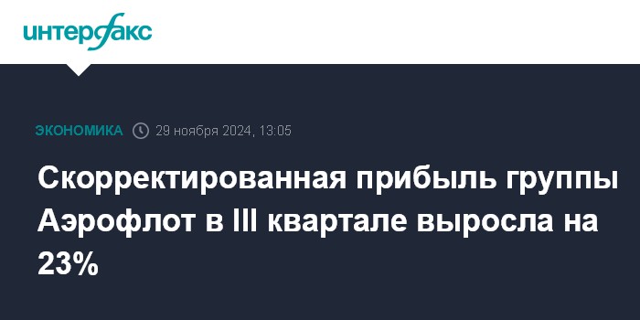 Москва. 29 ноября. INTERFAX.RU - В III квартале 2024 года скорректированная прибыль группы "Аэрофлот" выросла на 23,3% в годовом исчислении, до 21,6 млрд рублей, сообщила компания.