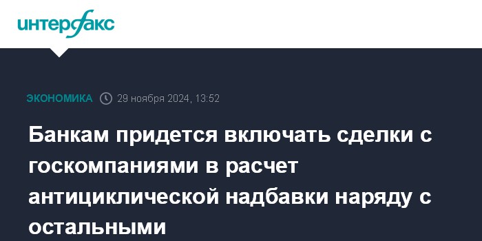 Москва. 29 ноября. INTERFAX.RU - ЦБ РФ, который с 1 февраля 2025 г. вводит антициклическую надбавку к нормативам достаточности капитала в размере 0,25%, обяжет банки включать в ее расчет сделки с госкорпорациями и компаниями с долей государственной собственности более 50%. Сейчас для них действует исключение, которое при нулевом значении антициклической надбавки прикладного значения не имеет.