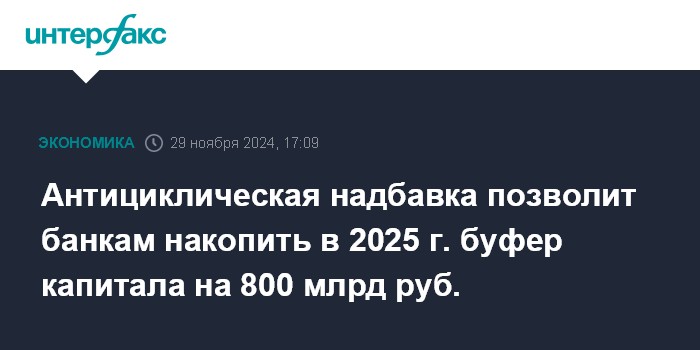 Москва. 29 ноября. INTERFAX.RU - Введение антициклической надбавки и ее последующее повышение в 2025 году позволит банкам накопить буфер капитала в размере 800 млрд рублей. Об этом заявил на пресс-конференции в пятницу зампред ЦБ Филипп Габуния.