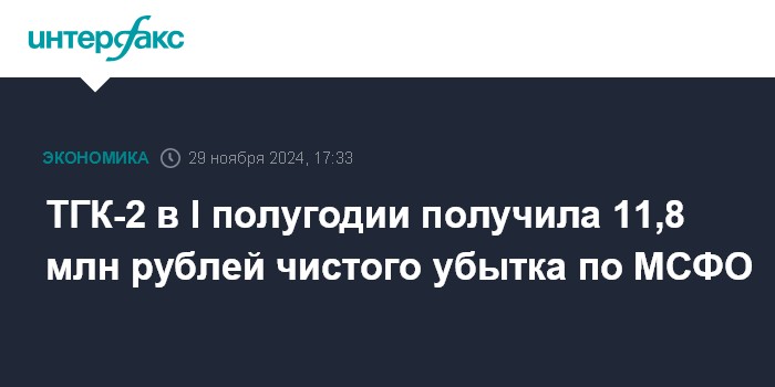 Москва. 29 ноября. INTERFAX.RU - ПАО "ТГК-2" в январе-июне 2024 года получило 11 839 000 рублей чистого убытка по МСФО 1 746,5 млн рублей чистой прибыли годом ранее, сказано в его отчетности.