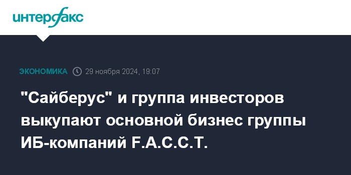 Москва. 29 ноября. INTERFAX.RU - Фонд развития результативной кибербезопасности АО "Сайберус" и группа частных инвесторов выкупают часть активов группы компаний F.А.С.С.Т. (ранее российский бизнес Group-IB, головная структура группы - ООО "Адаптивные технологии безопасности", которой принадлежит еще пять компаний, включая ООО "Ф.А.К.К.Т."), сообщил фонд.