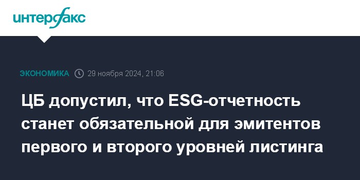Москва. 29 ноября. INTERFAX.RU - Банк России начал обсуждать с рынком возможность введения обязательной отчетности в области устойчивого развития для эмитентов первого и второго котировального списка, сообщили "Интерфаксу" в пресс-службе регулятора.