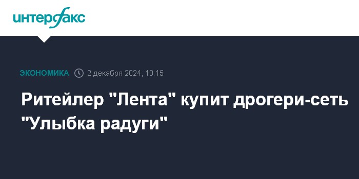 Москва. 2 декабря. INTERFAX.RU - МКПАО "Лента" приобретает 100% сети магазинов в формате дрогери "Улыбка радуги", сообщил ритейлер.
