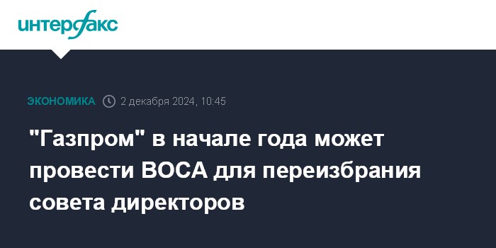 Москва. 2 декабря. INTERFAX.RU - ПАО "Газпром" в феврале-марте 2025 года может провести внеочередное собрание акционеров для избрания совета директоров в новом составе, сообщил "Интерфаксу" источник, знакомый с ситуацией.