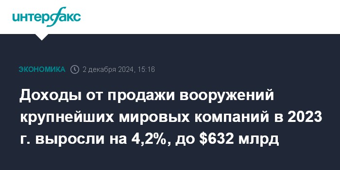 "Доходы от продажи оружия и военных услуг 100 крупнейших компаний отрасли достигли $632 млрд в 2023 году, что на 4,2% больше в реальном выражении по сравнению с 2022 годом", - говорится в докладе.