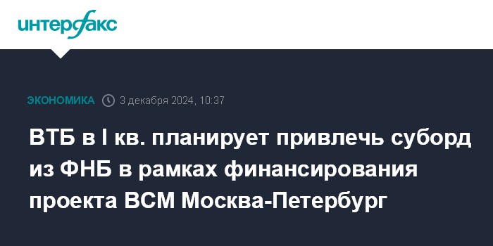 ВТБ в I кв. планирует привлечь суборд из ФНБ в рамках финансирования проекта ВСМ Москва-Петербург