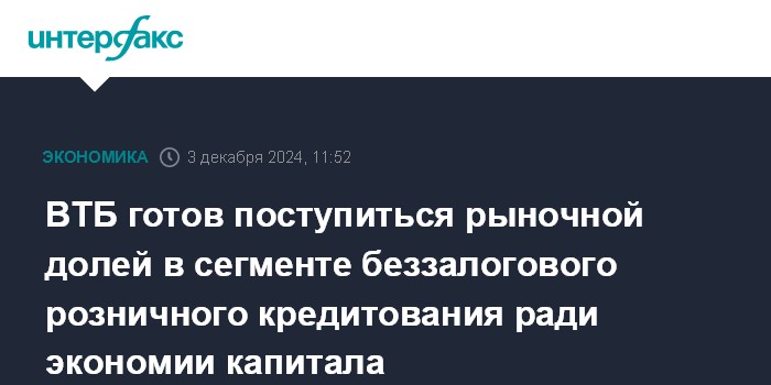 ВТБ готов поступиться рыночной долей в сегменте беззалогового розничного кредитования ради экономии капитала