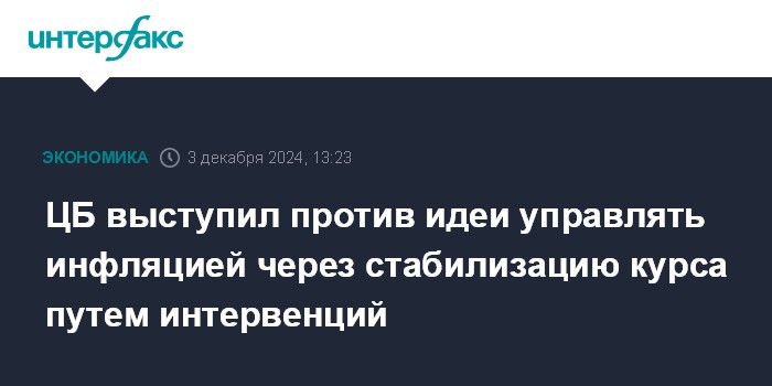 Москва. 3 декабря. INTERFAX.RU - Позиция Банка России в отношении призывов повлиять на динамику курса непоколебима: регулятор по-прежнему не видит оснований бороться с инфляцией через сглаживание ситуации на валютном рынке, а не через изменение ключевой ставки.