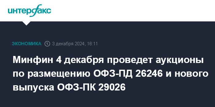 Минфин 4 декабря проведет аукционы по размещению ОФЗ-ПД 26246 и нового выпуска ОФЗ-ПК 29026
