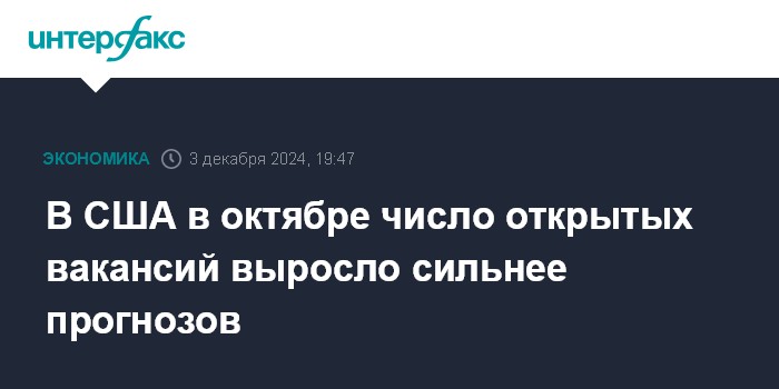 Москва. 3 декабря. INTERFAX.RU - В США в октябре количество открытых вакансий увеличилось на 372 тысячи к сентябрю и составило 7,744 млн, говорится в отчете Министерства труда страны, основанном на результатах ежемесячного опроса (JOLTS).
