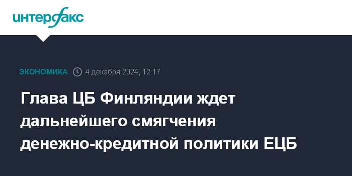 Глава ЦБ Финляндии ждет дальнейшего смягчения денежно-кредитной политики ЕЦБ
