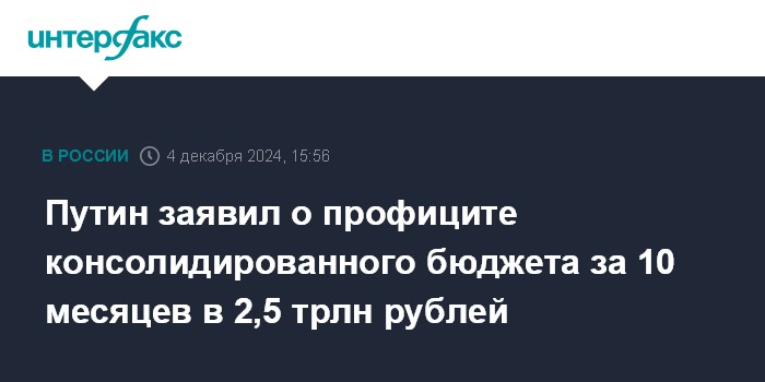 Москва. 4 декабря. INTERFAX.RU - Консолидированный бюджет РФ за десять месяцев 2024 года был исполнен с профицитом в размере порядка 2,5 трлн рублей, сообщил на форуме ВТБ "Россия зовет!" президент Владимир Путин.