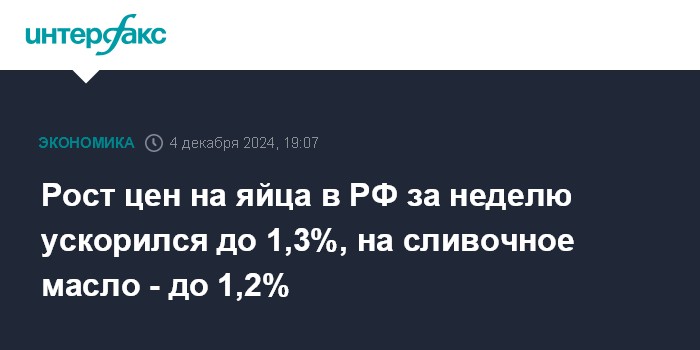 Рост цен на яйца в РФ за неделю ускорился до 1,3%, на сливочное масло - до 1,2%
