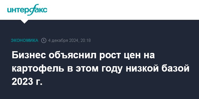 Москва. 4 декабря. INTERFAX.RU - Рост цен на картофель в этом году обусловлен в основном низкой базой 2023 года, когда был получен рекордный урожай, который привел к существенному падению цен, заявил журналистам председатель Союза участников рынка картофеля и овощей (Картофельный союз) Сергей Лупехин.