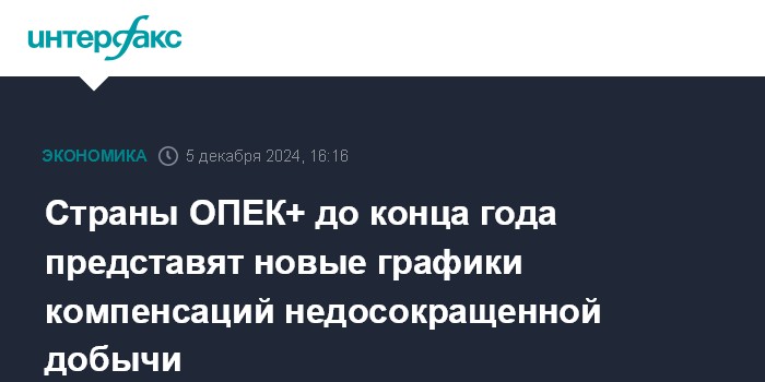 Москва. 5 декабря. INTERFAX.RU - Страны ОПЕК+, которые с января 2024 года допустили превышение оговоренных объемов добычи в рамках этой сделки, должны до конца года представить в секретариат ОПЕК обновленные графики компенсации этих объемов, говорится в пресс-релизе ОПЕК.