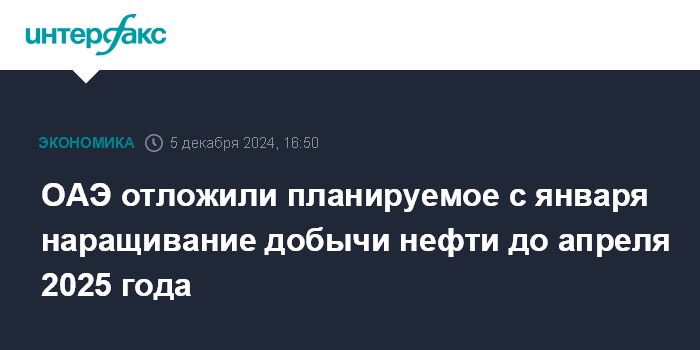 Москва. 5 декабря. INTERFAX.RU - ОАЭ, которые в июне согласовали увеличение своей квоты по добыче нефти в рамках ОПЕК+ на 300 тысяч баррелей в сутки постепенно с января по сентябрь 2025 года, теперь решили отложить начало наращивания до апреля 2025 года, сообщает Bloomberg со ссылкой на делегата сегодняшних переговоров.