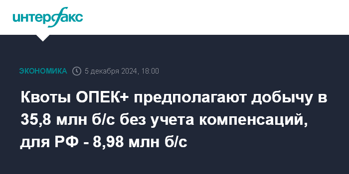 Квоты ОПЕК+ предполагают добычу в 35,8 млн б/с без учета компенсаций, для РФ - 8,98 млн б/с