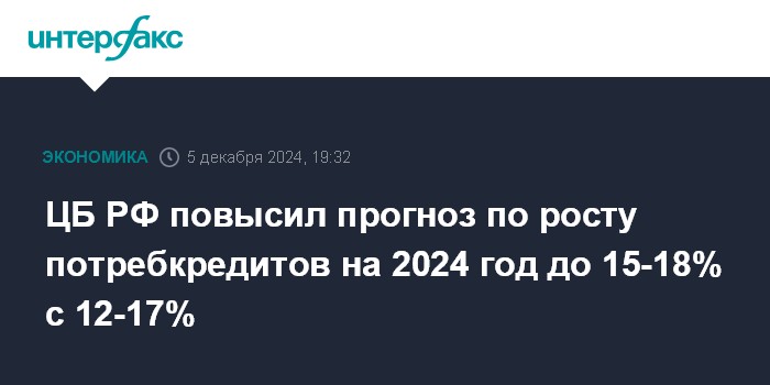 Москва. 5 декабря. INTERFAX.RU - Банк России повысил прогноз по росту потребительских кредитов на 2024 год до 15-18% с 12-17% ранее, говорится в аналитическом обзоре ЦБ по банковскому сектору.