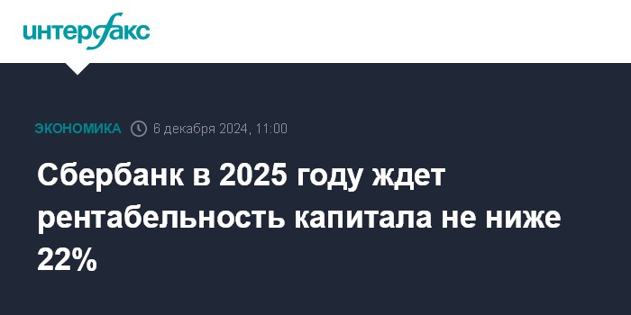 Москва. 6 декабря. INTERFAX.RU - Сбербанк прогнозирует в 2025 году рентабельность капитала на уровне не ниже 22% и ожидает восстановление группового норматива достаточности капитала до 13,3% с учетом выплаты дивидендов в размере 50% от чистой прибыли за 2024 год, заявил глава банка Герман Греф на дне инвестора.