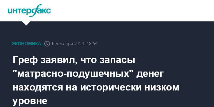 Греф заявил, что запасы "матрасно-подушечных" денег находятся на исторически низком уровне