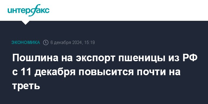 Пошлина на экспорт пшеницы из РФ с 11 декабря повысится почти на треть