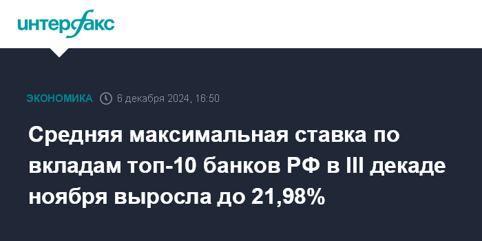 Москва. 6 декабря. INTERFAX.RU - Среднее арифметическое значение максимальных процентных ставок по вкладам в рублях (без учета вкладов с дополнительными условиями) десяти российских банков, привлекающих наибольший объем депозитов физлиц, в третьей декаде ноября 2024 года выросло до 21,98% годовых с 21,56% во второй декаде, следует из материалов на сайте ЦБ РФ.