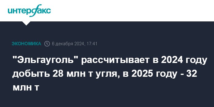 Москва. 6 декабря. INTERFAX.RU - Угледобывающий холдинг "Эльгауголь" планирует в 2024 году добыть 28 млн тонн угля, а в 2025 году - 32 млн тонн, сообщила представитель компании на форуме "Золотой век Якутии".