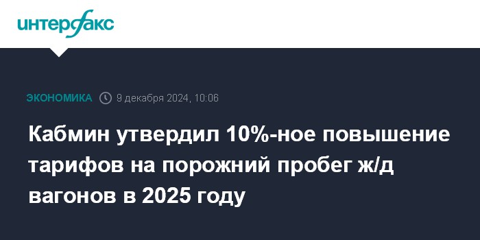 Москва. 9 декабря. INTERFAX.RU - Правительство РФ утвердило 10%-ное повышение тарифов на порожний пробег железнодорожных вагонов в 2025 году.