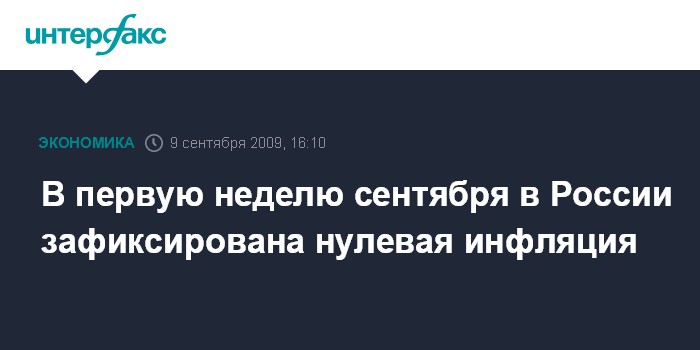 Москва. 9 сентября. INTERFAX.RU - За период с 1 по 7 сентября 2009 г. инфляция в России составила 0%. С начала года потребительские цены выросли на 8,1%. Об этом свидетельствуют данные Федеральной служба госстатистики. Для сравнения в 2008 году за первую неделю сентября инфляция составила 0,1%, с начала года - 9,8%. Сентябрьская инфляция в пролом году составила 0,8%.